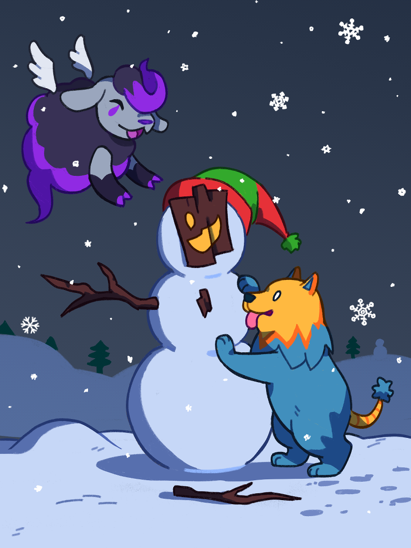 "Cassette Beasts winter illustration with Bansheep and Pombomb."